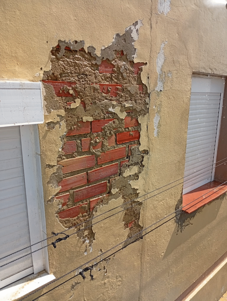 Saneado de fachadas: picado, reparación de fisuras e impermeabilización antes del nuevo revestimiento.